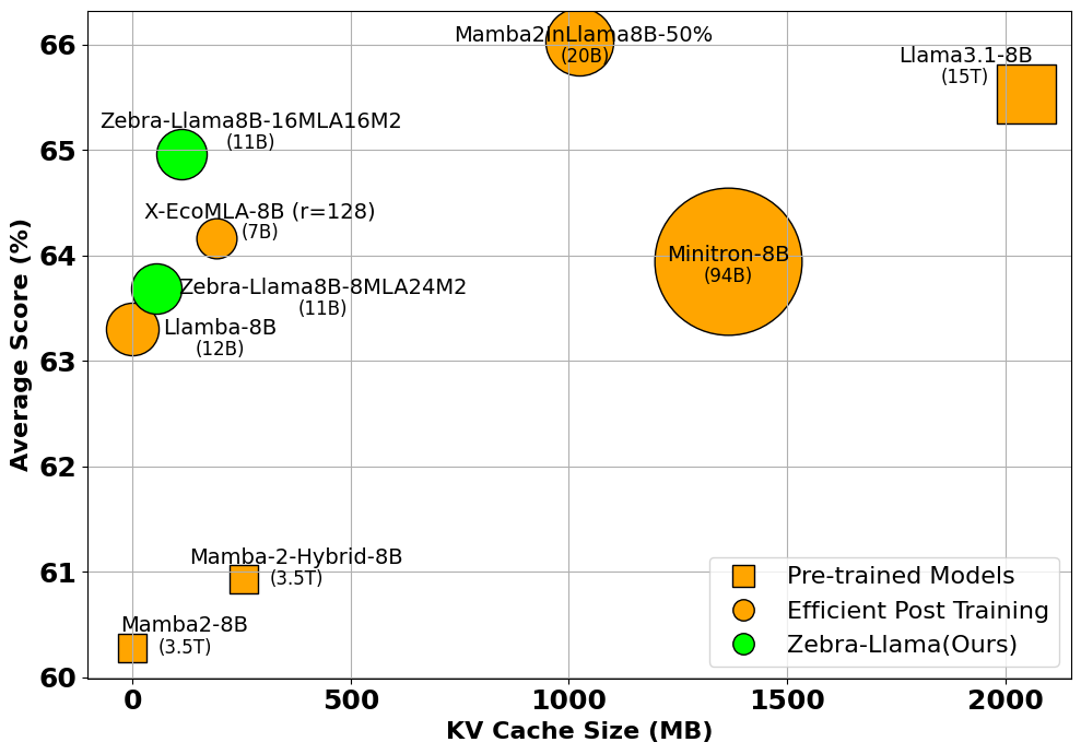 - Extreme KV Cache Compression: Zebra-Llama dramatically reduces the KV cache size to 2%-4% of the original Llama model while preserving 100% of its average zero-shot performance on LM Harness tasks.