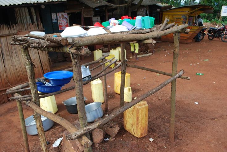 Akatale awatundibwa engoye ziwanikiddwa waggulu mulimu n'ensawo ate emabega w'akatale waliyo olusozi.